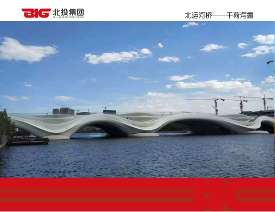 大橋全長360余米,其中主橋長210米,引橋長約150米,橋體鋼梁結構總重8000余噸。該橋梁封護系統(tǒng)為雙曲面FRP夾心板,造型優(yōu)美,雅名“千荷瀉露”,橋體按功能劃分三個區(qū)域:腹部、流水平臺和梯道步道區(qū)域。該橋建成后,有夜景燈光,有潺潺流水,動靜結合,營造了水鄉(xiāng)的文化意境,增強了生態(tài)感受,以低姿態(tài)形式映襯了北運河的同時,展現(xiàn)出極為豐富的藝術視覺效果。這是我國首次在橋梁建筑上大規(guī)模使用FRP材質建造。